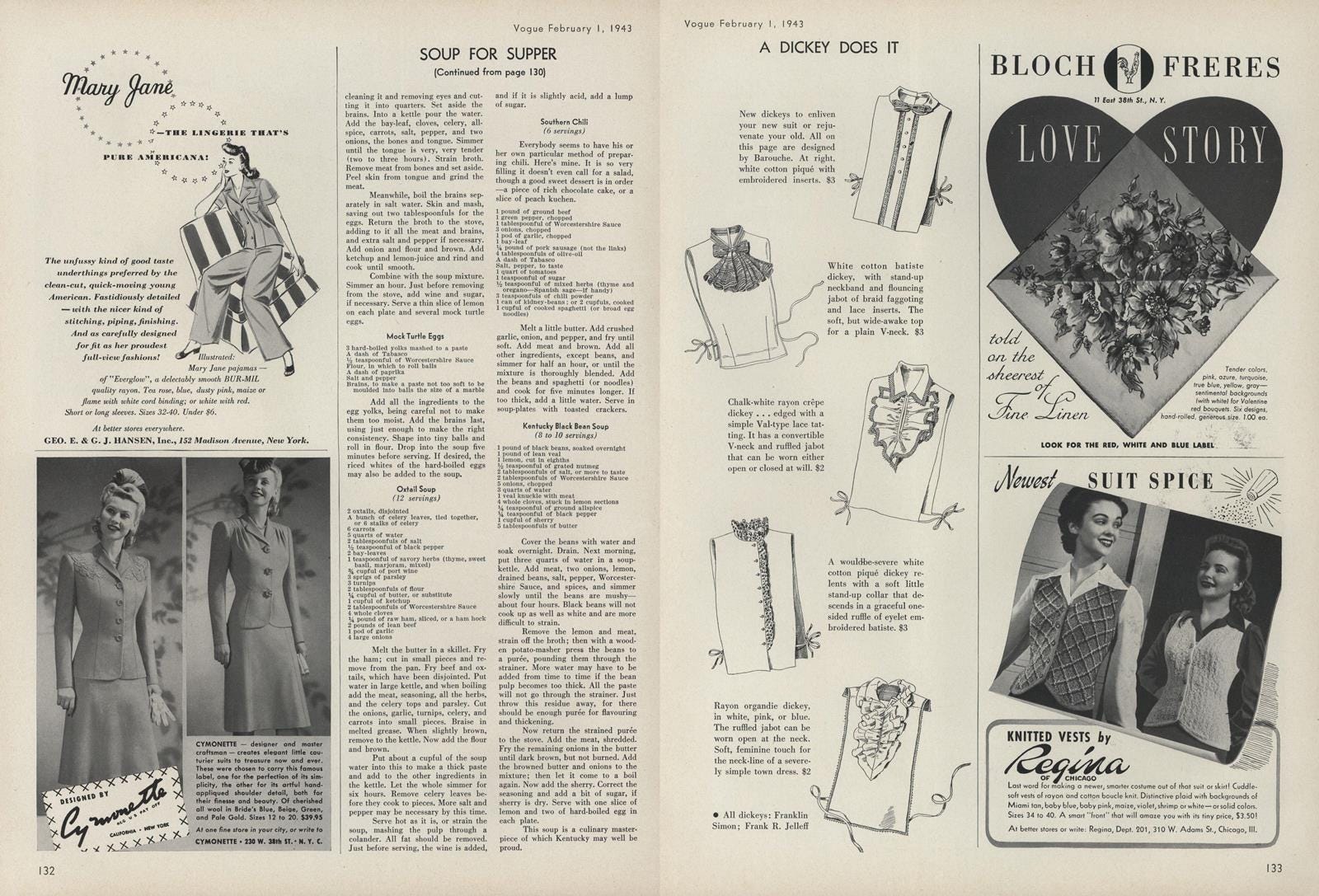 Over time, the dickey migrated into womenswear, where it took on a slightly different role: a new kind of accessory. By the 1940s, dickey dressing was synonymous with adding a little drama to a more basic outfit. Some of our favorite dickey-centric copy from the Vogue archive? So glad you asked… The dickeys of the ’40s were touted as “the soft, but wide-awake top for a plain v-neck” and “a feminine touch for the neckline of a severely simple town dress.” We’re sold.